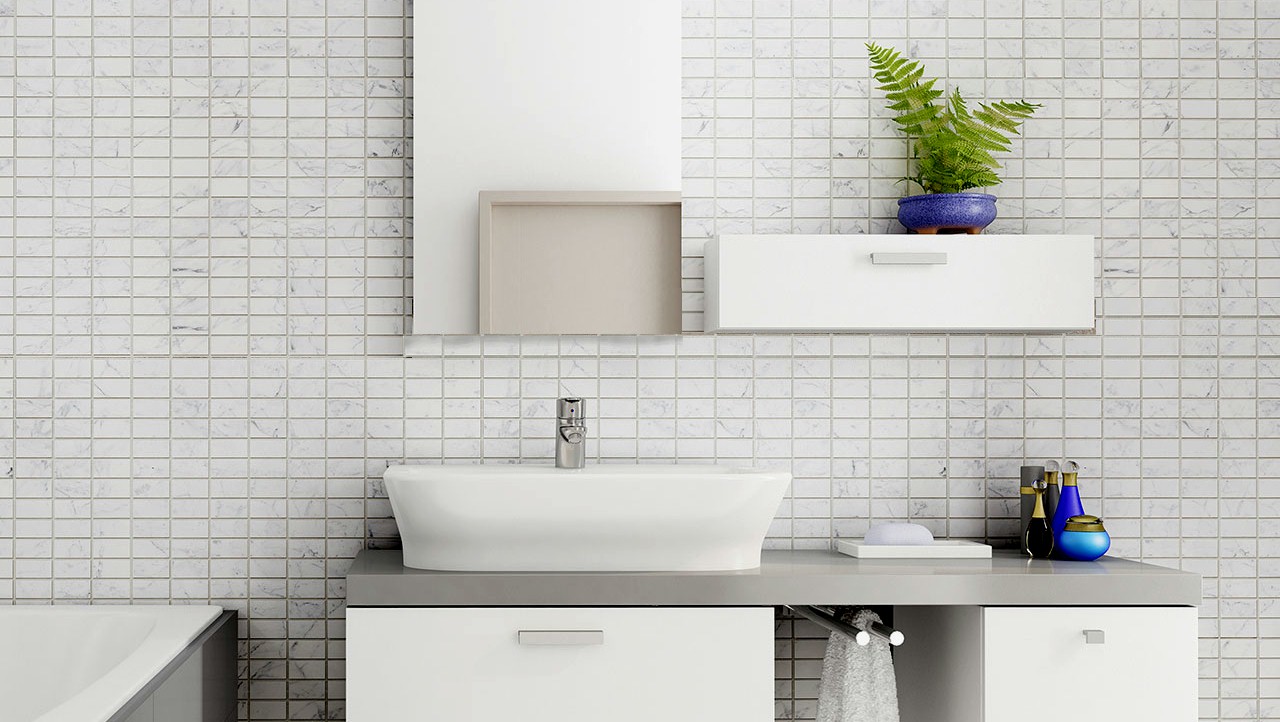 White mosaic tiles decorate the walls of this bathroom with a honeycomb pattern. Get inspiration for storage, materials and finishes. Most relevant best selling latest uploads. Create an elegant feature wall with mosaic tiles or break things up using bathroom border tiles. 0% finance available or monthly instalments available on all orders over £99 subject to status.